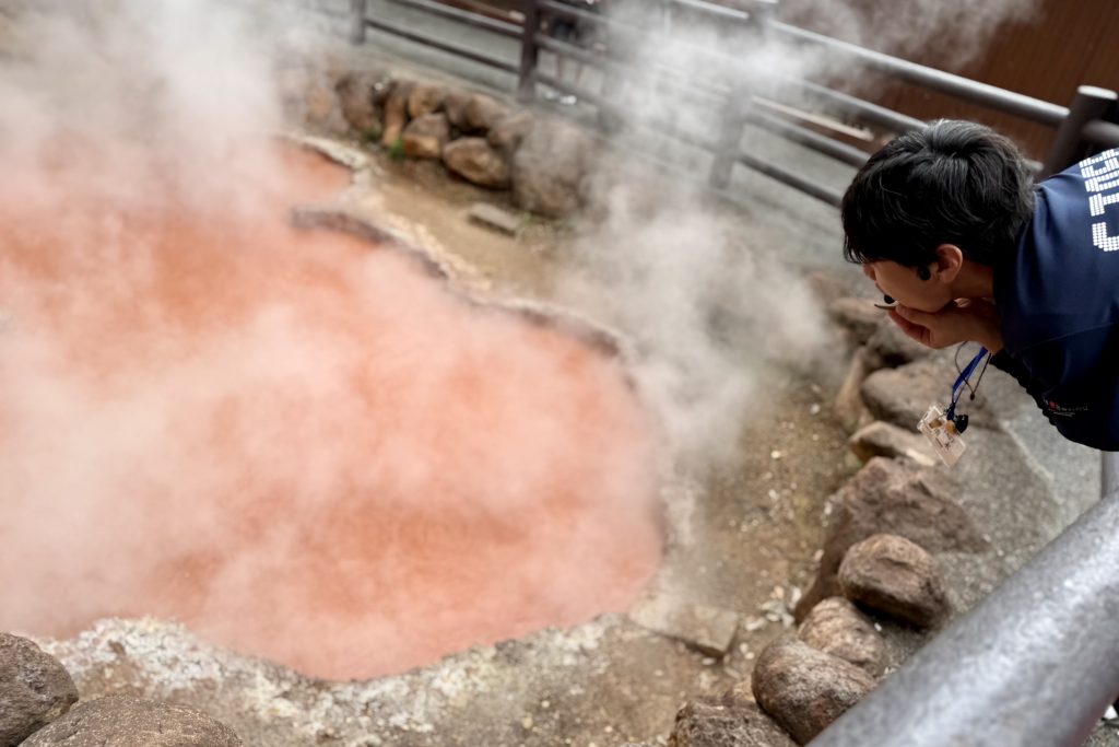 The name “Kamado” dates back over a century, when rice for Hachiman Kamado Shrine’s festival was cooked using steam from these very springs. At the entrance, a red demon statue still watches over the bubbling springs and the people who visit them— a fiery reminder that Beppu’s heat isn’t just from the earth, but from myth itself.