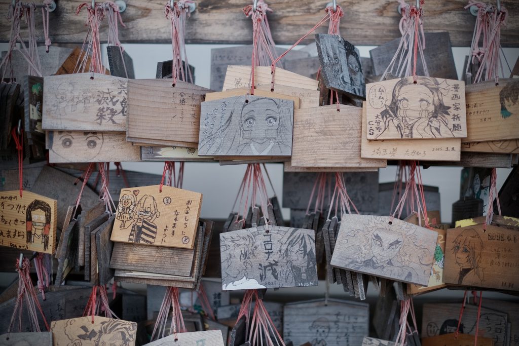 All around the shrine, you’ll find ema—wooden plaques covered with drawings and messages from fans all over Japan, many featuring favorite characters and wishes written with devotion worthy of the Demon Slayer Corps.