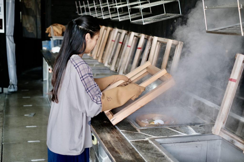 與別府其他需要親自操作的地獄蒸廚房不同,在「里之站 鐵輪 蒸de喜屋」用餐完全無需費心——工作人員會為你蒸好所有食物,您只需坐著欣賞施展魔法的瞬間。