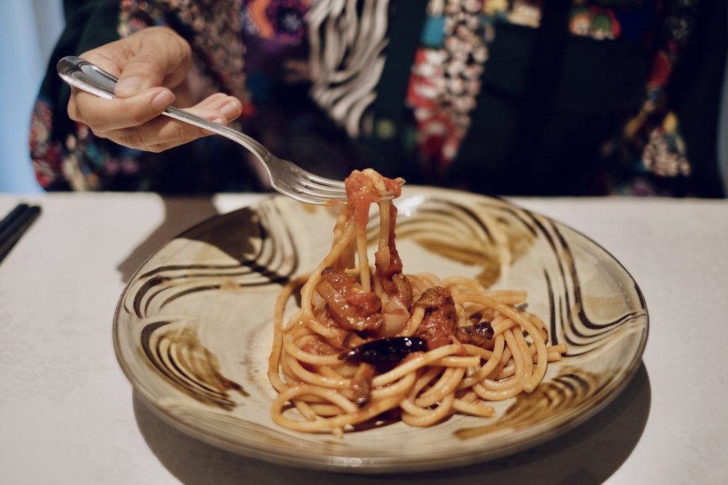 在餐廳的季節性菜單中,連義大利麵和甜點都順應著別府火山的節奏。招牌的義式培根茄汁吸管麵 (Bucatini Amatriciana) 使用地獄釜輕柔蒸煮,使麵條呈現近乎半透明的光澤、以及以烹調無法複製的深層風味。